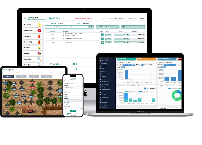 FacturaExpress, RestoExpress, CajaExpress y PayExpress se integran entre sí para que la información fluya sin interrupciones: ventas, pagos